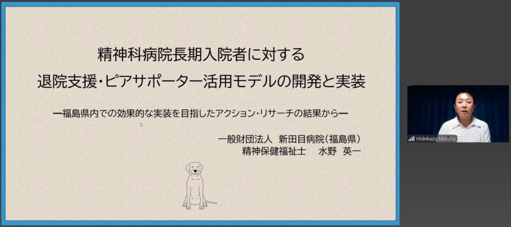 報告者は水野英一様(PBEE研究・研修センター賛同会員、福島県精神保健福祉士協会会長、一般財団法人新田目病院精神保健福祉士)でテーマは「精神科病院長期入院者に対する退院支援・ピアサポーター活用モデルの開発と実装:福島県内での効果的な実装を目指したアクション・リサーチの結果から」でした。23名のさまざまな領域・立場の皆様にご参加頂き、議論を進めました。