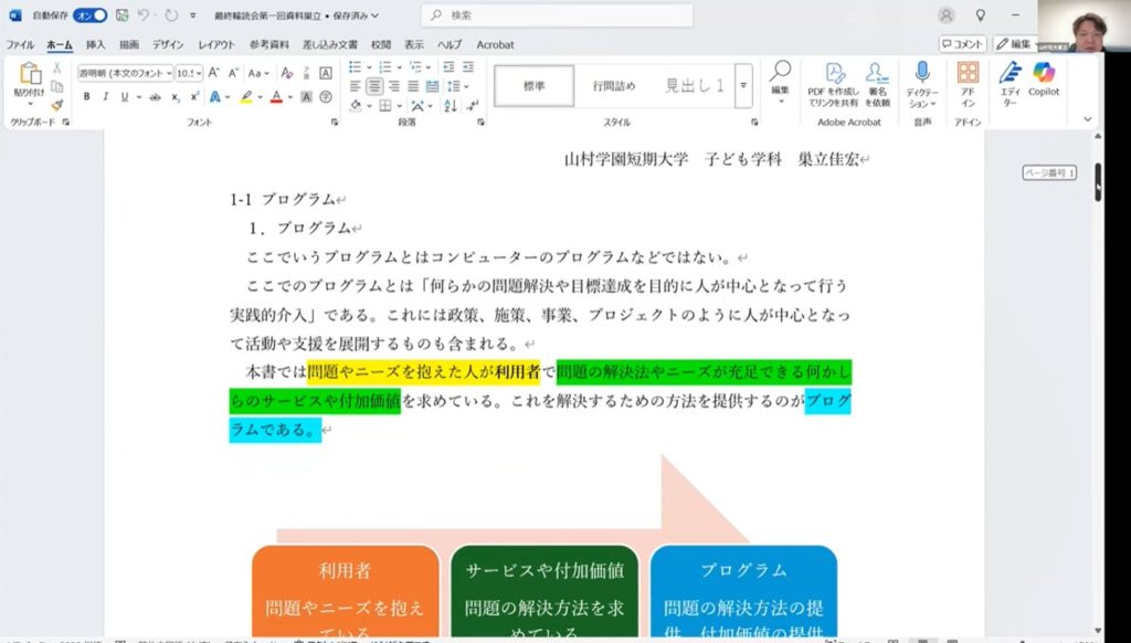 まず「プログラム」の定義について、本書では「何らかの問題解決や目標達成を目的に、人が中心となって行う実践的介入」とされていることが紹介されました。政策や事業、プロジェクトも含まれ、利用者の生活や福利の一部に関わるものであり、すべての問題を解決するものではないと整理されています。この説明に関連して、「付加価値」という用語の意味や範囲、その決定方法、利用者の期待と提供側の資源の関係などについて意見が交わされました。