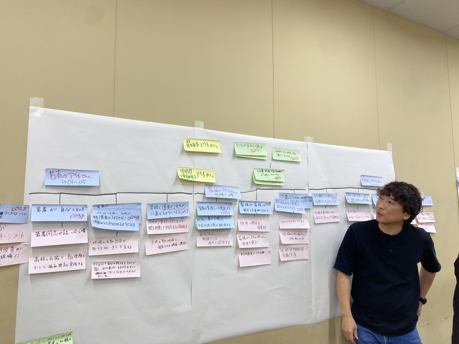 午後は、午前の内容を踏まえてロジックモデルの作成に挑戦しました。ファシリテーターが「このプログラムの最終的なゴールは何でしょうか」「このカードに手段・目的関係があるとすれば教えてください」などと問いかけながら進行しました。