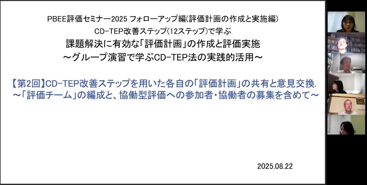(2025.8.22)PBEE評価セミナー2025 FollowUP編第2回(CD-TEP改善ステップを用いた各自の「評価計画」の共有と意見交換)を開催しました。