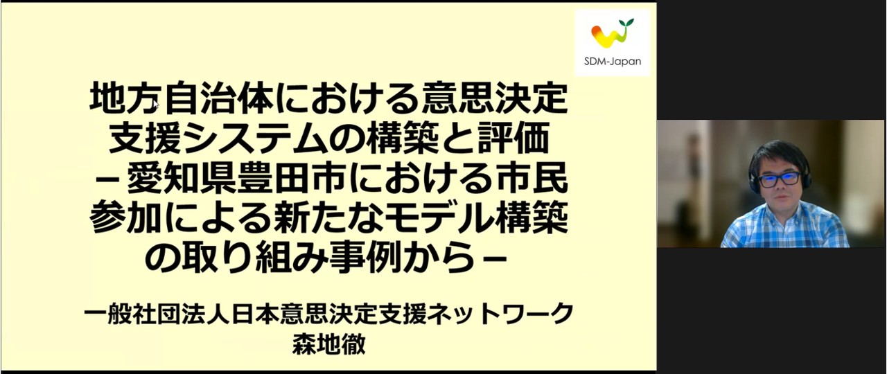森地様によると、一般社団法人日本意思決定支援ネットワークでは、「企業城下町」として知られる愛知県豊田市における社会的孤立の課題を解決するため、従来の成年後見制度の対象とならない方々や、対応が難しい方々に向けて、市民参加による新たな意思決定支援システムの構築に取り組んでいるとのことです。今回の研究会では、その実践内容について、ロジックモデルを基に作成されたアウトカム評価およびプロセス評価の結果をご報告いただきました。