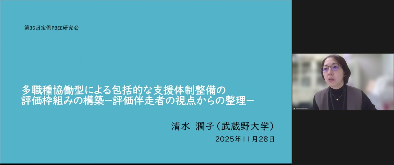 報告者は清水潤子様(PBEE研究・研修センター理事、武蔵野学院大学)で、テーマは「多職種協働による包括的な支援体制整備の評価枠組みの構築~評価伴走者の視点からの整備~」でした。当日は、さまざまな領域・立場の19名の皆様にご参加いただき、活発な議論が交わされました。