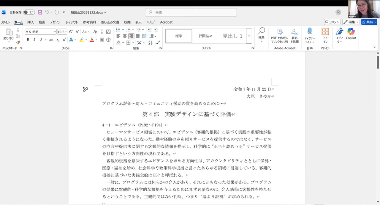 (2025.11.22)『(2025年度輪読会)プログラム評価~対人・コミュニティ援助の質を高めるために~』の第8回を開催いたしました。