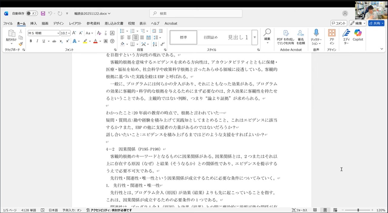 2025年11月22日(土)18:00より、2025年度輪読会の第8回を開催しました。今回の範囲は《第4部》「実験デザインに基づく評価」の(4-1)「エビデンス」から(4-5)「実験・準実験評価デザイン」までで、報告は大原さやか氏(弘前学院大学/PBEE研究・研修センター事務局)が担当しました。少人数での開催ということもあり、参加者のコメントを随時募りながら議論を進めました。