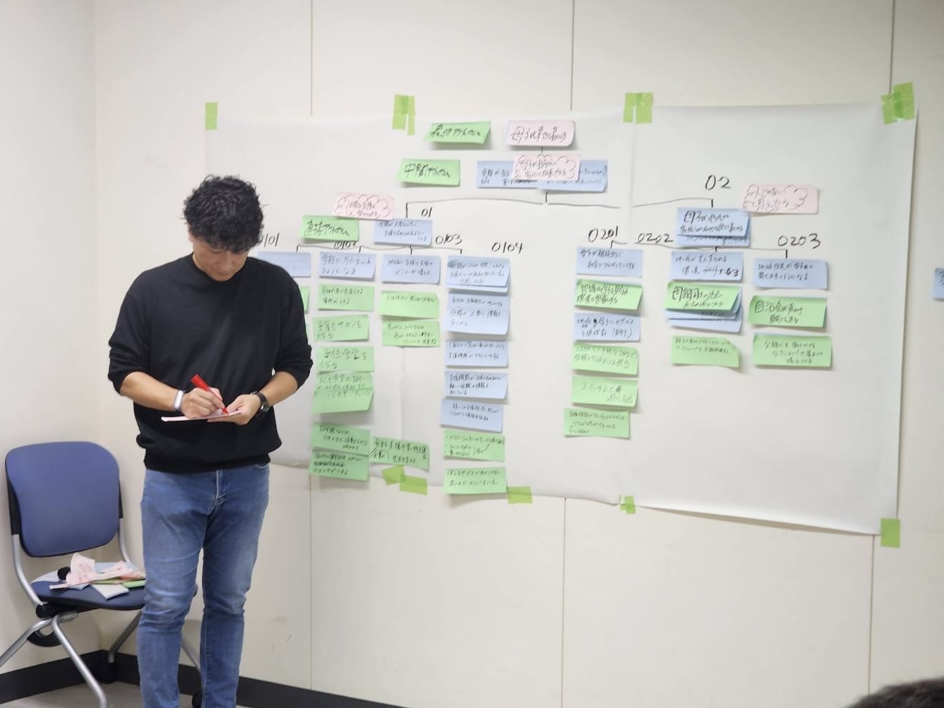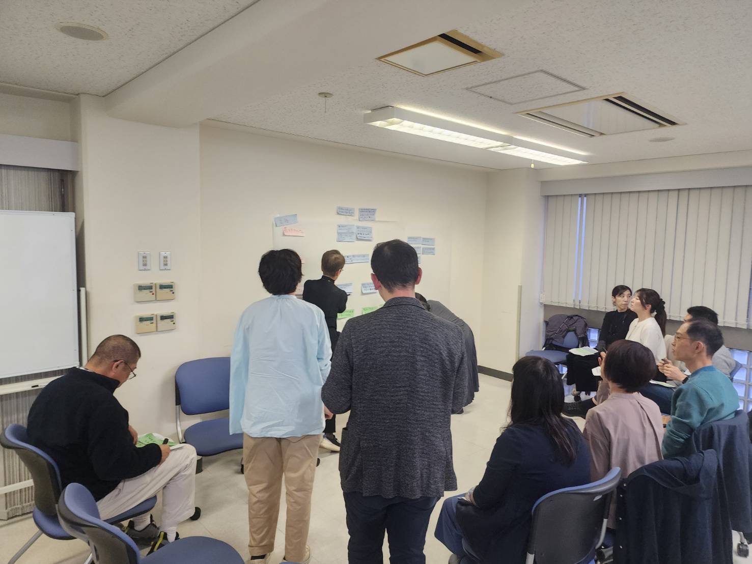 参加者はまず自分の考えをポストイットに書き出し、それらを「私たちの意見」として模造紙に貼り出しながら議論を重ねました。特定の正解を提示するのではなく、最終アウトカムから逆算しながら、必要な変化や取組みを問い続けることが重視されました。