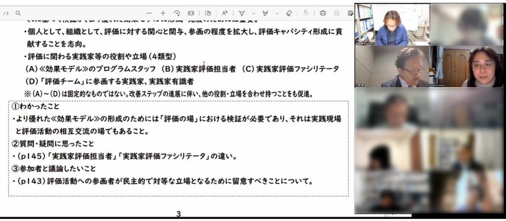 『実践家参画型エンパワメント評価の理論と方法:CD-TEP法輪読会第4回(第6章:CD-TEP改善ステップ:実践家参画型の評価活動をサポートするガイドライン』を開催いたしました!