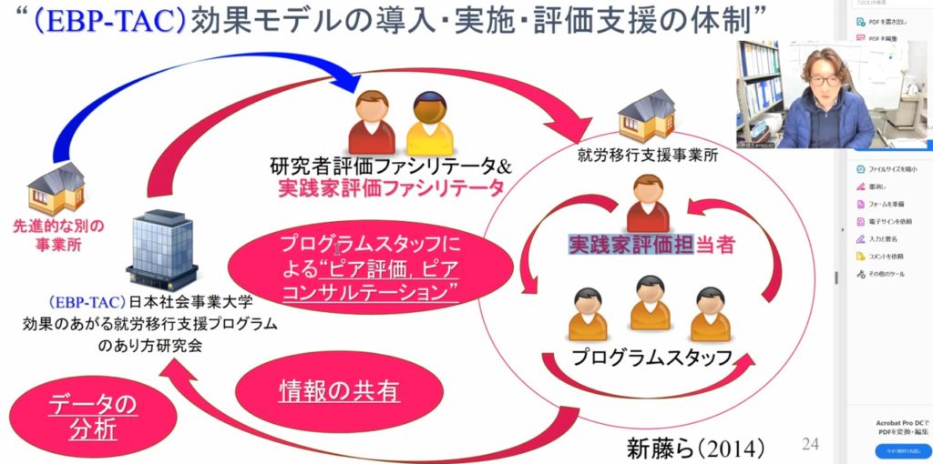また、参加者のお一人から「CD-TEP法は実践家参画型(参加型評価やエンパワメント評価)に重きを置いた方法であるが、EBP(Evidence-Based Practices)をつくっていく方法としてそれが最適な方法といえるのか、参加型という文脈のなかでエビデンスではなく現場の感覚のようなものが入り込んでしまうということが危惧されないか」という投げかけがあり、これに対して「例えば、NAMI(米国精神障害者家族連合会)では評価文化が家族レベルでも浸透していて、こうした取組みからは当事者や実践家が(自らの取組みに対する)エビデンスを持つことによってエンパワーされることが証明されている。なかなか解決されない深刻な状況の解決のためには研究者も実践家も協働しなければならない」や「現行の因習など、エビデンスやデータに基づかない議論は避けるべき。一方で、科学的エビデンスを現場に提示してもそれを受け入れてもらえないこともあり、高度な専門知(エビデンス)を現場に使ってもらうためにも参加型で実施する必要がある」といったやり取りがありました。