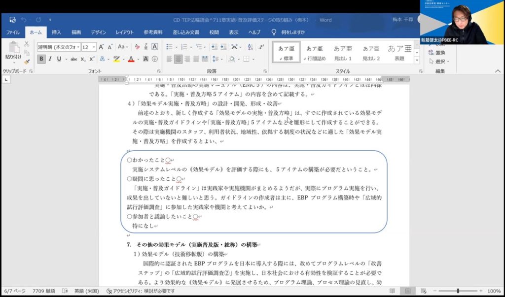 『実践家参画型エンパワメント評価の理論と方法:CD-TEP法輪読会第9回(第11章:実施・普及評価ステージの取り組み:実施・普及方略第1~12ステップ)』を開催いたしました!