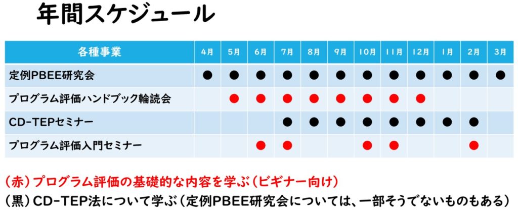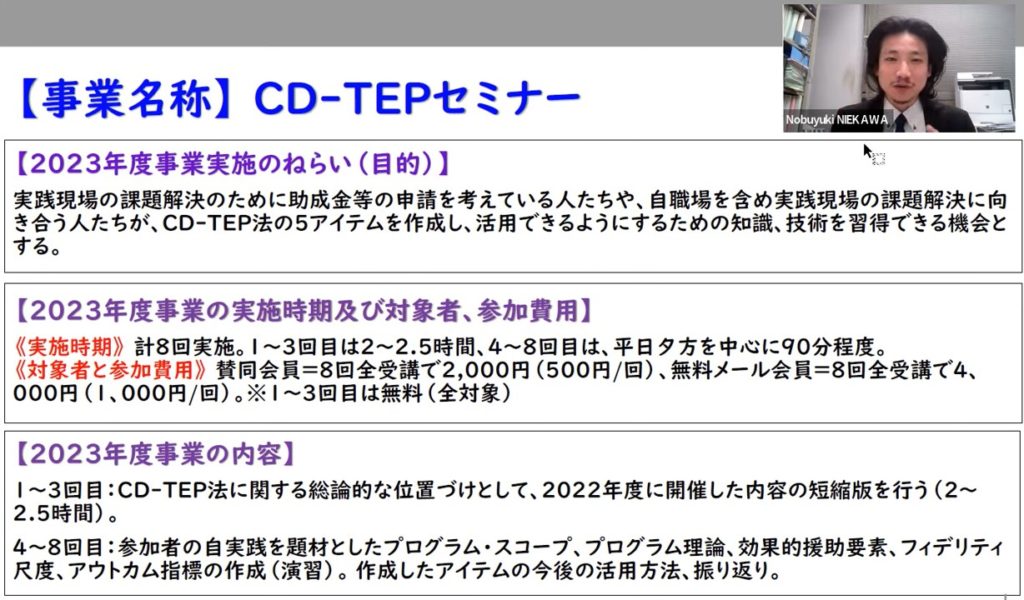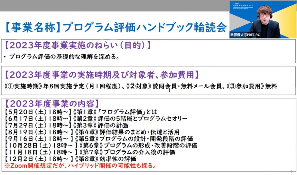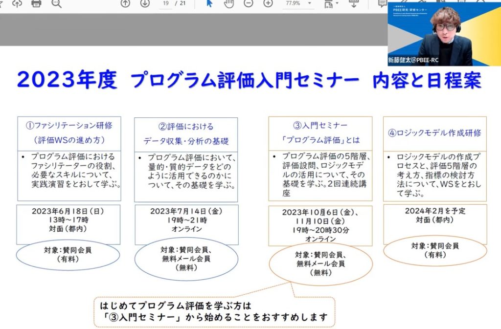 その後、2023年度に企画している研究事業(PBEE定例研究会)及び研修事業(プログラム評価ハンドブック輪読会、CD-TEPセミナー、プログラム評価入門セミナー)についてご案内をさせていただき、最後に、賛同会員・無料メール会員についてご説明をさせていただきました。