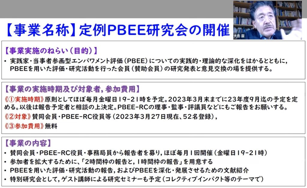 2023年3月30日(木)18時30分~、「一般財団法人PBEE研究・研修センター2023年度事業説明会」を開催致しました。