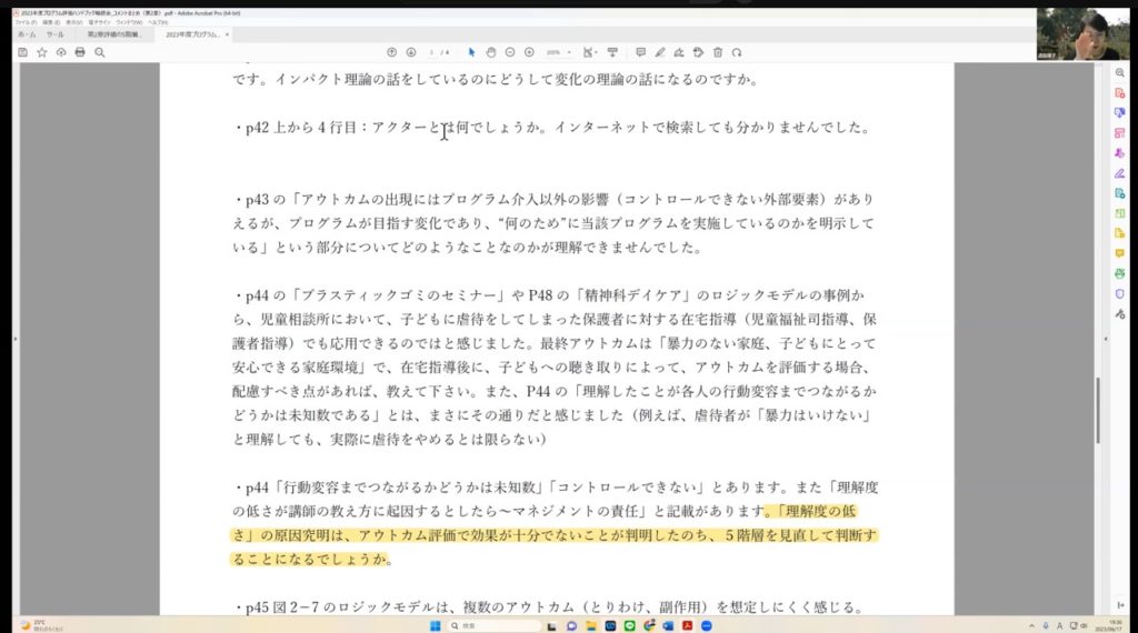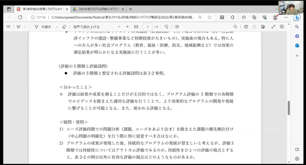 2023年6月17日(土)18時~、「プログラム評価ハンドブック輪読会2023」の第2回を開催いたしました。第2回は「第2章:評価の5階層とプログラムセオリー」をテーマとして取り上げ、報告担当者の和田氏による報告といくつかのご質問にもとづくディスカッションを行いました。