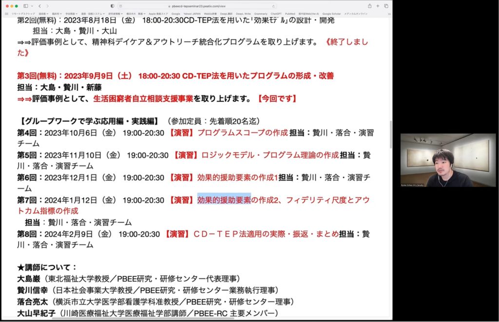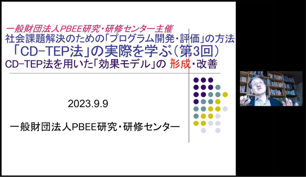2023年9月9日(土)18時より「PBEE評価セミナー2023 社会課題解決のための「プログラム開発・評価」の方法:「CD-TEP法」の実際を学ぶ(第3回)CD-TEP法を用いた「効果モデル」の形成・改善」を開催しました。