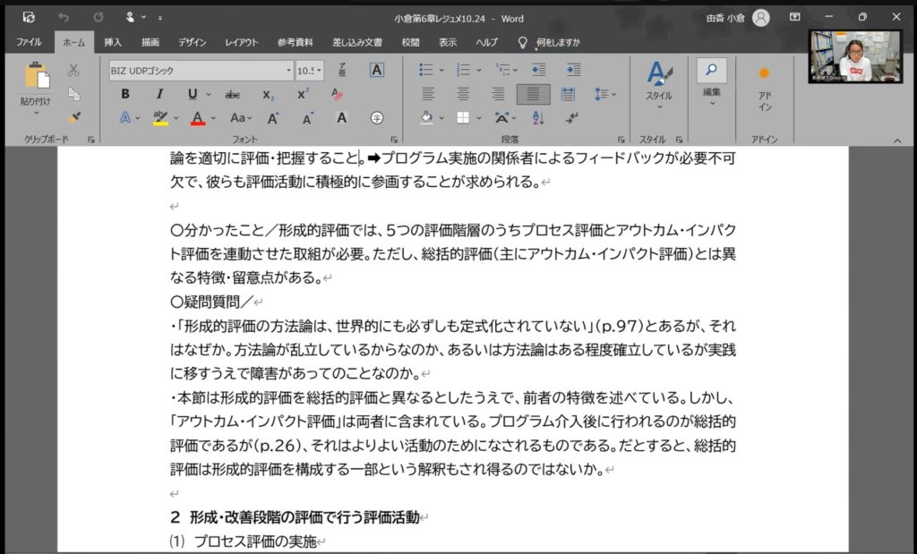 特に今回、形成的評価について深く議論が行われました。「そもそもプログラム評価は全てが形成的評価なのではないか(そのような目的で行われるものなのではないか)」というコメントもあり、プログラム評価の本質的な部分について考えさせられました。プログラム評価の実施を通して、プログラムを改善したり、仮説を組み直したりすること、またその際にはアウトカムを数量化して測定できるようにし、プログラム実施前後、あるいはプログラムの有無によってその違いを把握すること、また、必ずしも数量化ばかりではなく、プロセス評価やセオリー評価には定性的評価が一定の重要性を持っていることなど、重要なことを多く学ぶことができました。