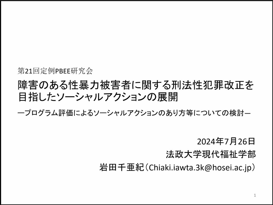 7月26日(金)19:00~第21回定例研究会が開催されました。報告者は法政大学現代福祉学部の岩田千亜紀先生で、テーマは「障害のある性暴力被害者に関する刑法性犯罪改正を目指したソーシャルアクションの展開 ~プログラム評価によるソーシャルアクションのあり方等についての検討~」でした。