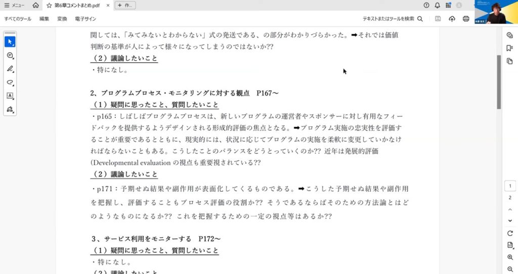 2024年9月21日(土)18時~、「プログラム評価の理論と方法2024」の第6回を開催いたしました。第6回は「第6章:プログラムプロセスをモニターし、アセスメントする」をテーマとして取り上げ、報告者の北川氏による報告といくつかの質問にもとづくディスカッションを行いました。