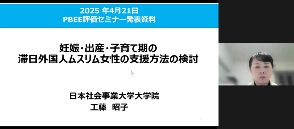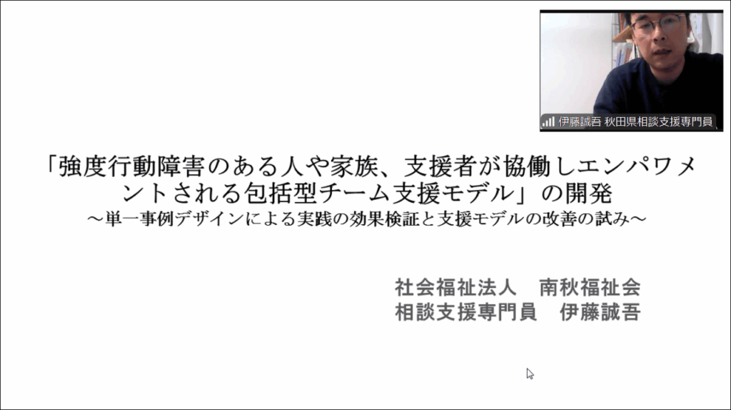 2025年度初の今回の定例研究会では、「2024年度PBEE評価セミナーFollow Up編(評価計画の作成と実施編)修了者【特選】報告会」ということで、昨年度の伊藤誠吾さま(秋田県・指定相談支援事業所南秋 つくし苑)と工藤昭子さま(日本社会事業大学大学院)にご報告いただきました。
