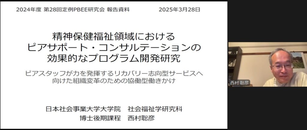 (2025.3.28)第28回定例研究会:西村聡彦様「精神保健福祉領域におけるピアサポート・コンサルテーションの効果的なプログラム開発研究」を開催しました。
